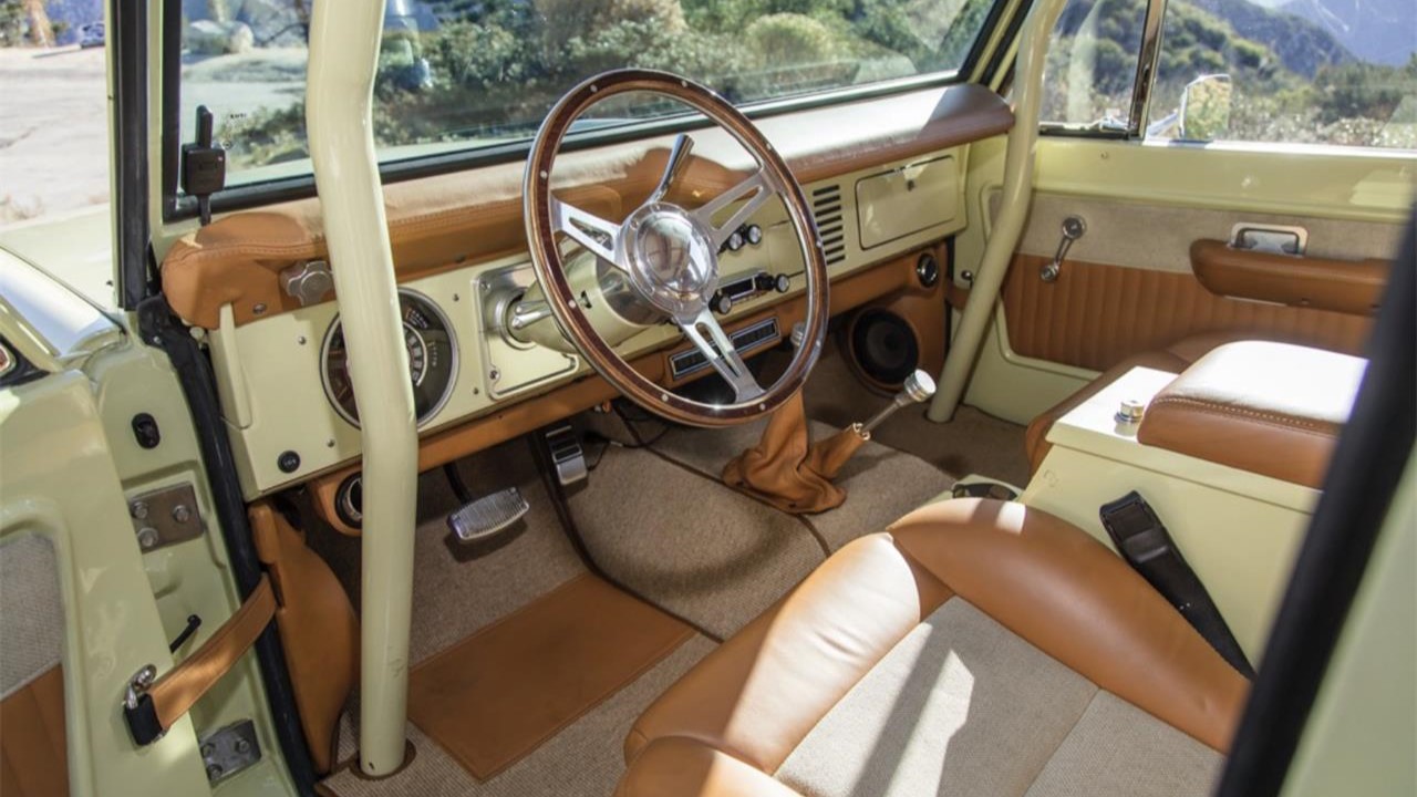 A pair of AMP Research power running boards ease access into the cabin, which was decked out with butterscotch leather and tan cloth, a combination that coordinates perfectly with the exterior’s light green. It still looks old-school despite nearly everything being new or modernized. The gorgeous aftermarket wood-rimmed wheel is connected to power steering. There’s still a column-mounted shifter, but it’s linked to a 6R80 six-speed automatic. See those metal pedals? Pressing the one on the left summons the power of a hydroboost braking system with discs at all four corners. Whether the hardtop is on or off, the Vintage Air air conditioning and heat will keep everyone comfortable. If the sound of the highway or the gravel on the trail below gets old, the RetroSound Bluetooth head unit, four 6.5-inch Focal speakers, 10-inch Focal subwoofer, and five-channel Focal amplifier can pump out music that’s perfect for road trips or off-road fun.