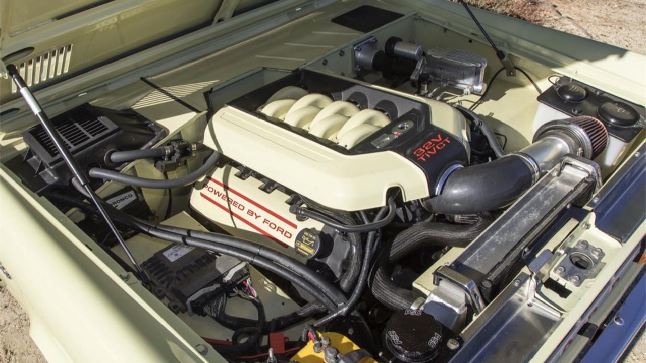 ASC4X4 made sure to upgrade things under the hood, too. Instead of an I6 or a 302ci V8, this ’72 Bronco has a 435-horsepower Gen II Coyote 5.0-liter V8 crate engine from Ford Performance. That would look great stock, but ASC4X4 went the extra mile and painted the engine and valve covers New Lime to match the body.