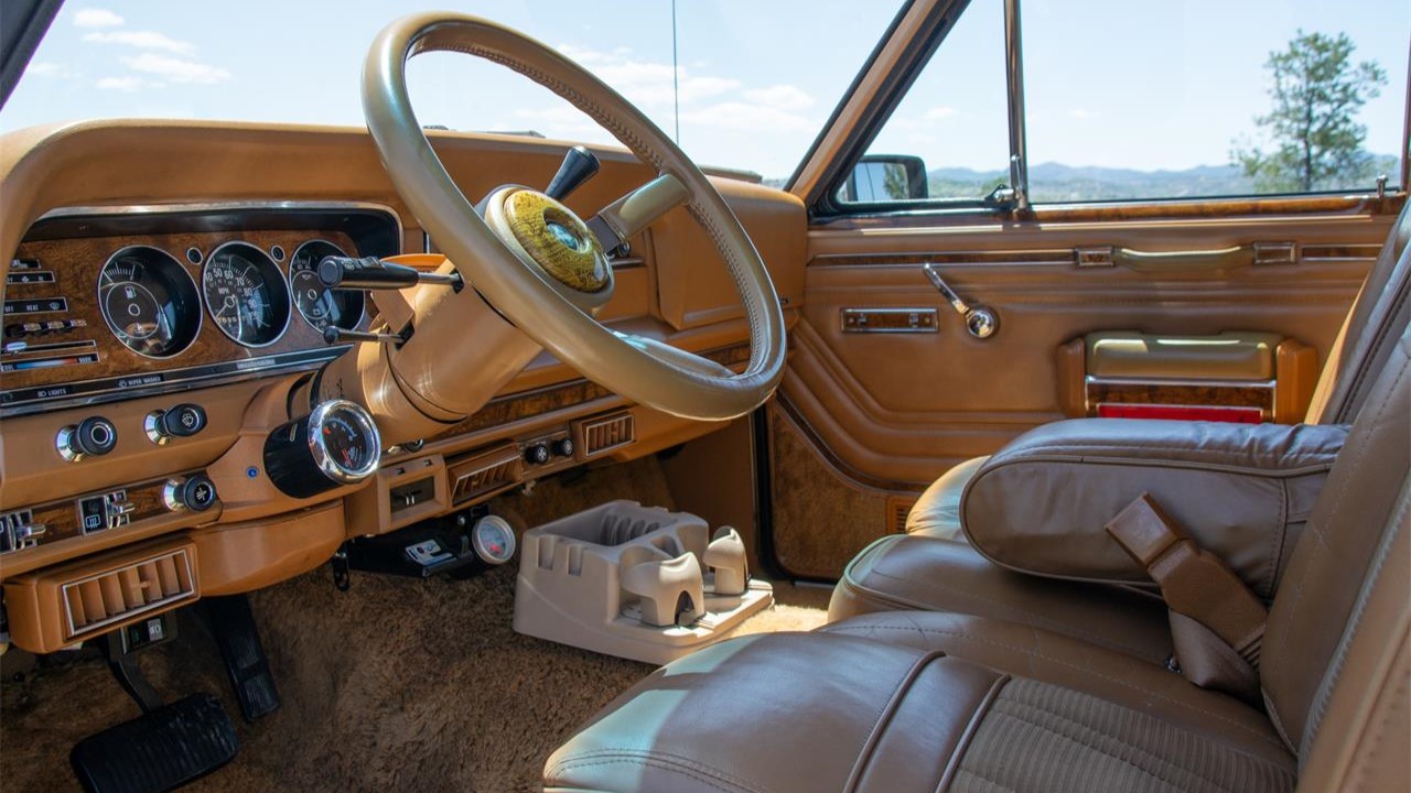 Speaking of horses – and horsepower: Under the hood of this Jeep is a 140-horsepower 360ci V8 mated to a three-speed automatic transmission and a dual-range transfer case. The all-wheel drive system was advanced for its time; it was dubbed “Selec-Trac” since it allowed “on-the-fly” 4WD selection. An MSD ignition system and a high-flow air filter have been added to this Grand Wagoneer.