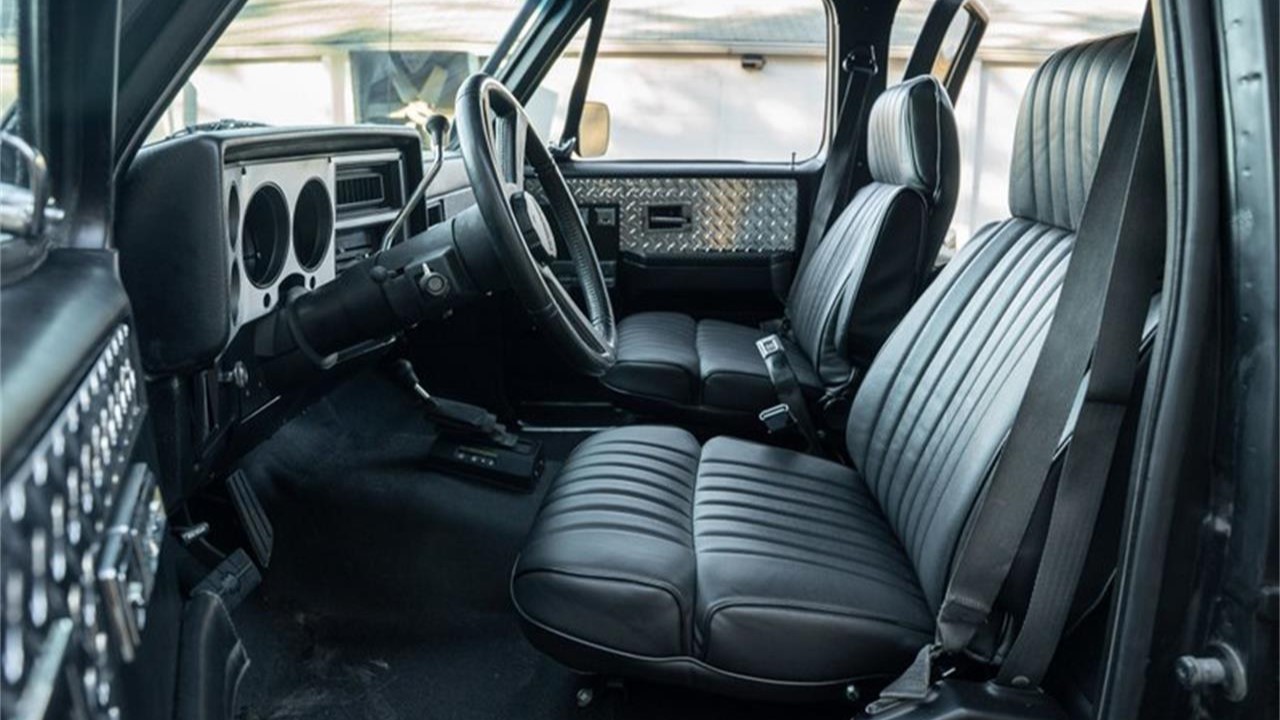 Inside, the floor has been covered with heavy-duty vinyl that can be easily cleaned after you splash through water and mud. New black vinyl covers the front bucket seats and the rear bench. A custom switch panel controls the auxiliary exterior lighting, which includes a light bar in the grille guard and spotlights.