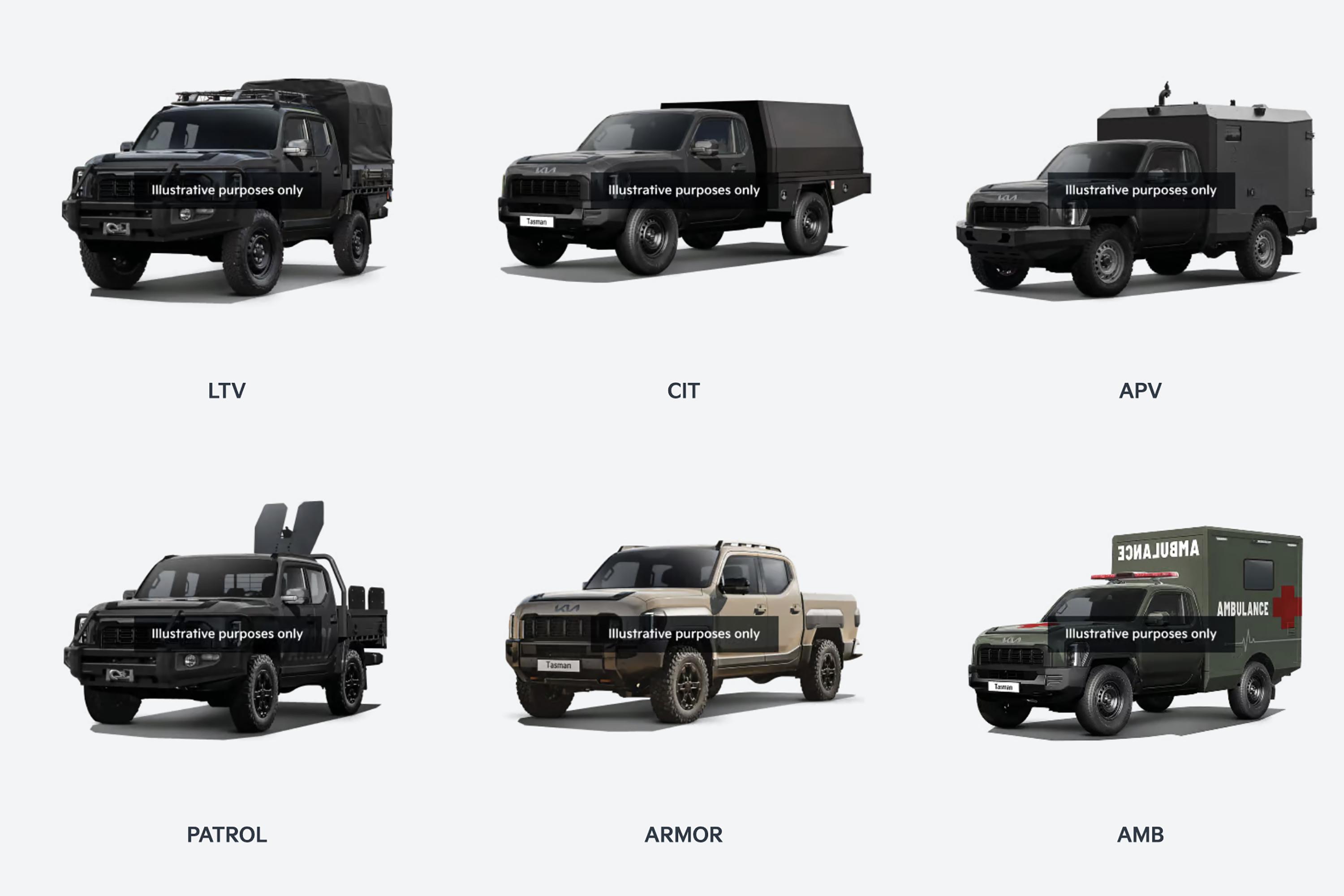 Interestingly, the other military example vehicles shown on the page are based on the existing Tasman body and have the text “Illustrative purposes only” slapped on them.