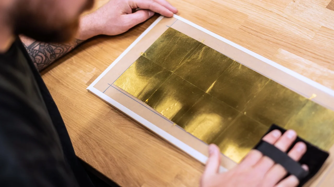 To learn the art of gold leafing, also known as gilding, five people from Rolls-Royce’s Interior Surface Centre took a special course at West Dean College in South East England. Starting with hand-laid sheets of high-gloss 24-carat gold leaf approximately 0.1 micrometers thick, they precisely cut “roads” for the map sections, then set them in the wood veneers.