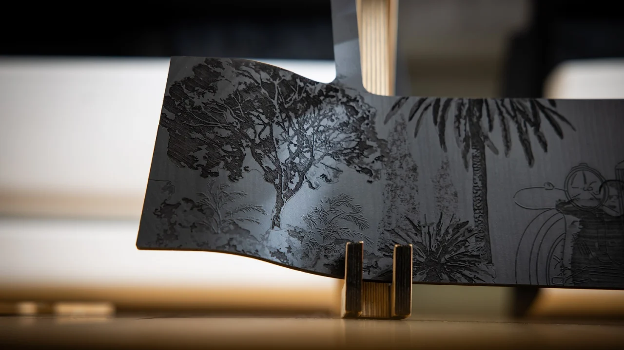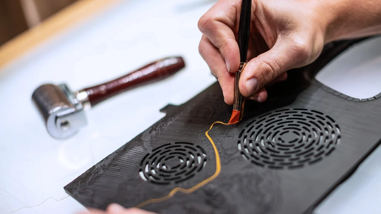 The 3D marquetry goes in the opposite direction, adding raised designs to the main surface of the wood so that they can be felt as well as seen. Layers of ink accent the veneers with three-dimensional textures and patterns.