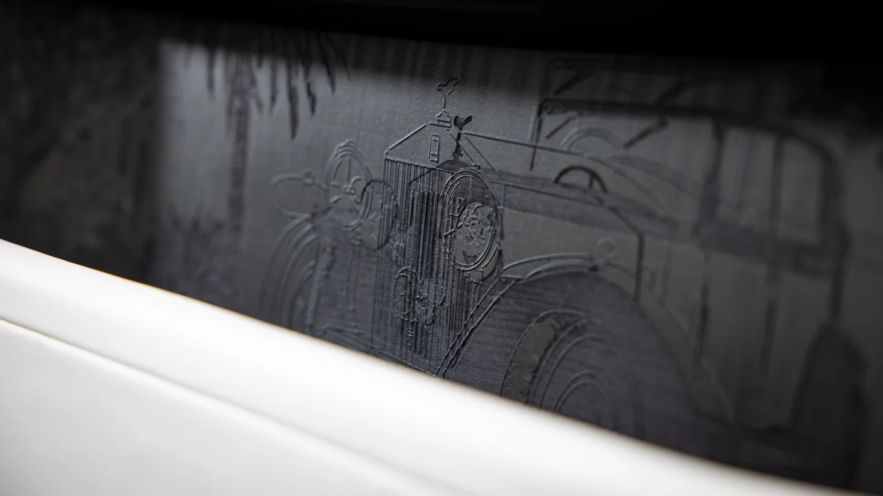 For the Private Collection, Rolls-Royce’s craftspeople spent a year developing wood interior panels made with three firsts for the company: 3D marquetry, 3D ink layering, and gold leafing. They selected sheets of Blackwood veneer, then laser-etched design elements such as maps, landscapes, flowers, trees, and locations significant to the Phantom’s history at three different depths. The lower levels appear darker, producing contrasts in light and color. Instead of cutting holes for the metal speaker grilles, the woodworkers milled the openings directly into the veneer.
