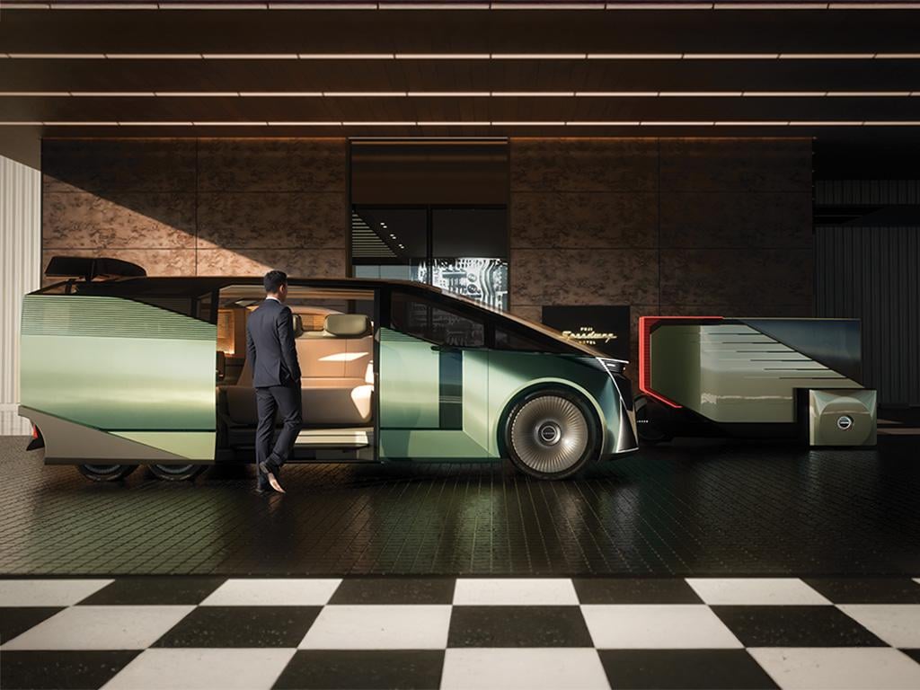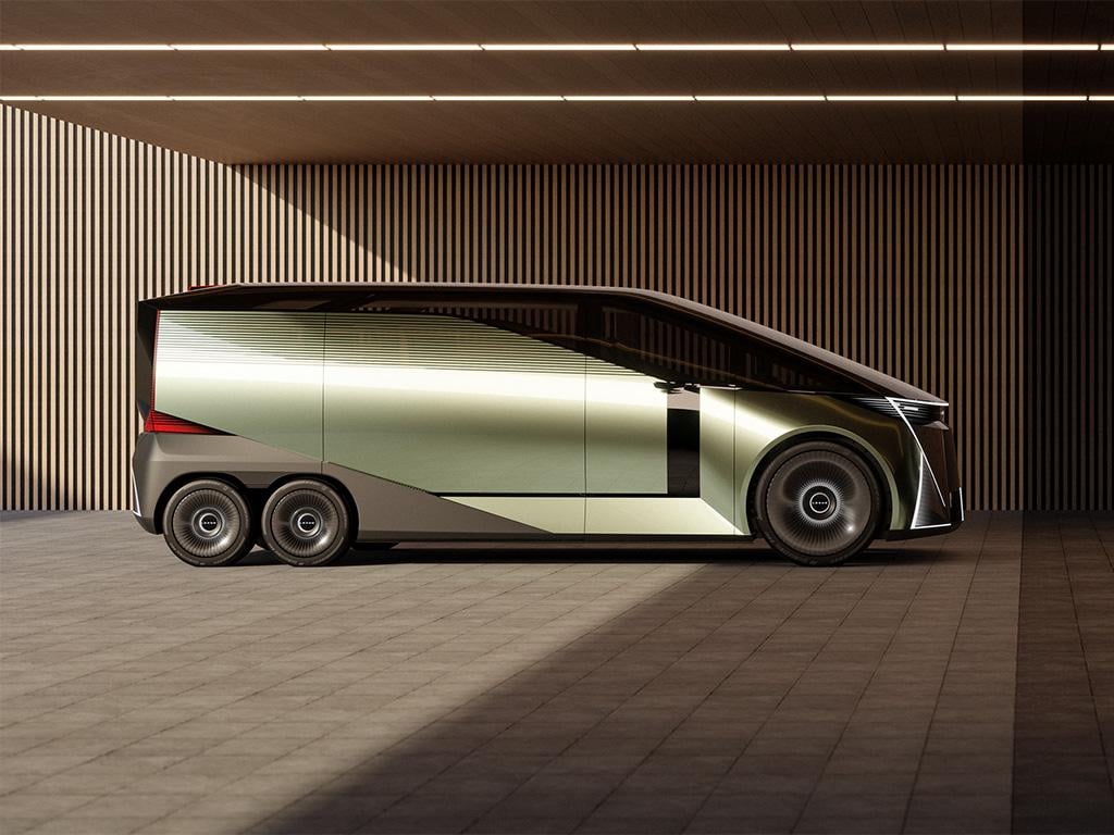 The side profile sees a massively raked front windscreen and huge front wheels, as well as four smaller rear wheels behind a set of sliding doors that enable access to the second and third-row seating.