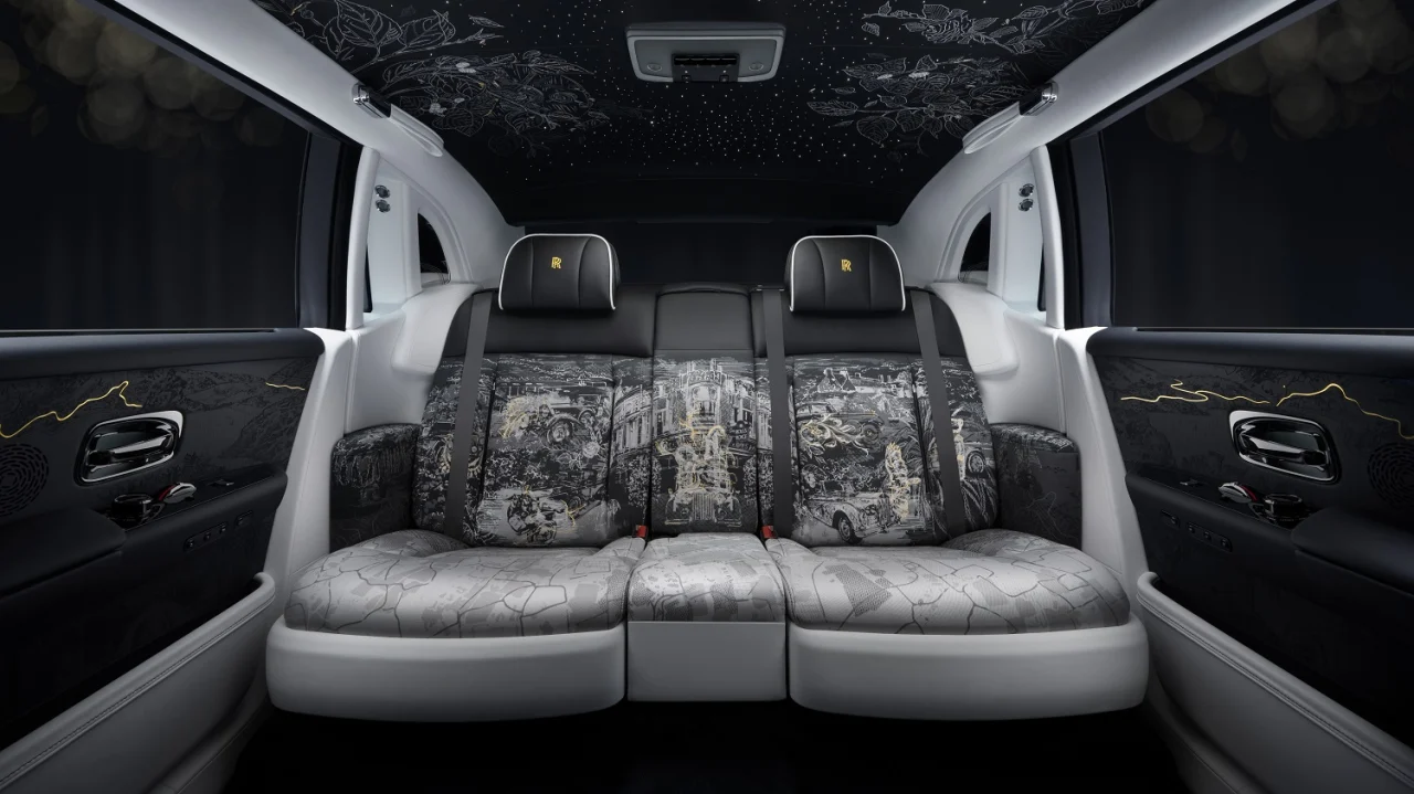 Rolls-Royce worked with a fashion atelier to develop the fabrics used in the second row, which was inspired by the 1926 “Phantom of Love” and its handwoven Aubusson tapestries. The upholstery tells the brand’s story through three layers.