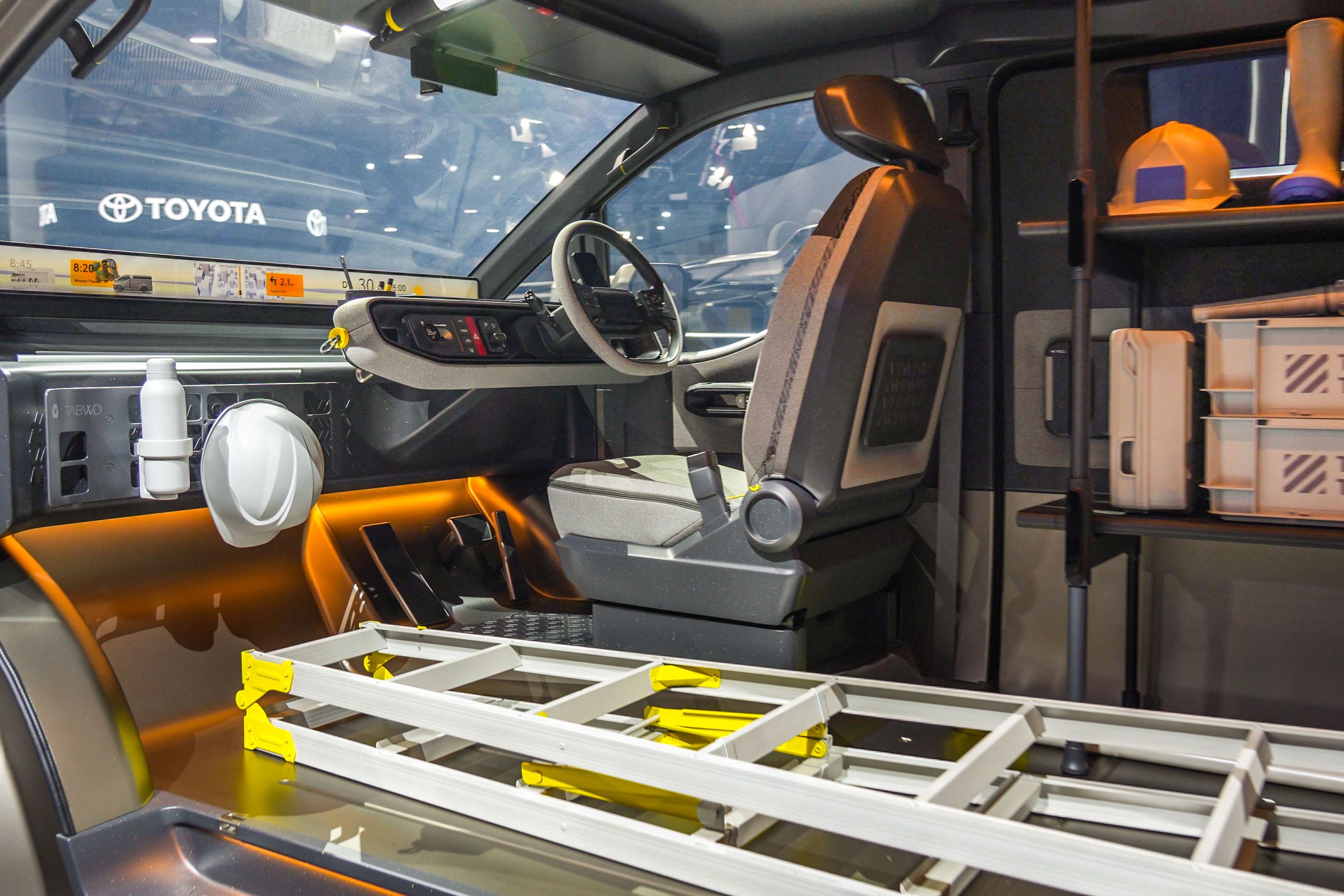 The dashboard pod seems to carried straight over from the HiAce Concept, although there’s a plane-style yoke replaces the two-spoke steering wheel, and the full-width display has been junked in favour of a smartphone holder.