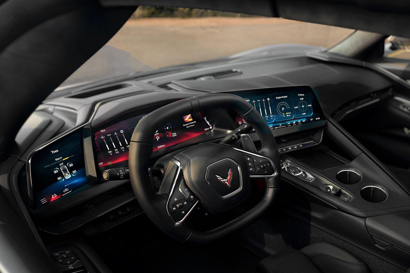 Even the cupholders have been updated and now feature ambient lighting, hand-wrapped inserts, and the crossed-flag Corvette emblem at their base.