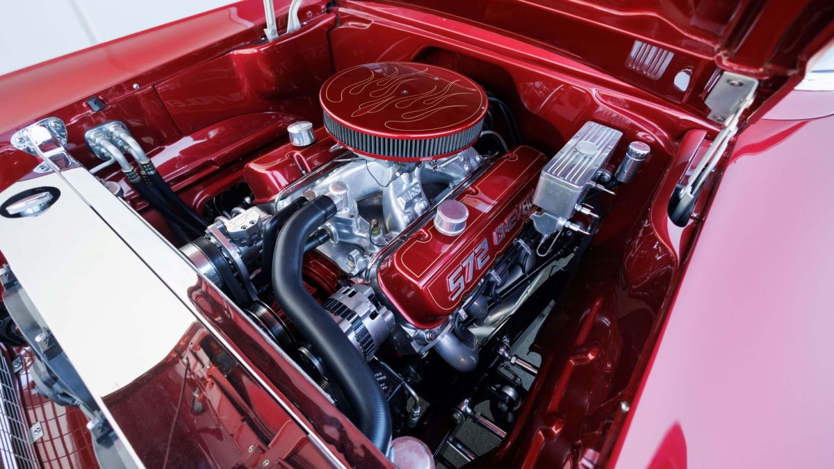Modern touches—A/C, four-wheel disc brakes, power steering, custom gauges, tilt steering wheel and polished wheels wrapped in performance rubber—make this restomod as comfortable as it is powerful. Underneath, the Art Morrison Tri-5 GT Sport chassis delivers precision handling worthy of the world’s best builds.