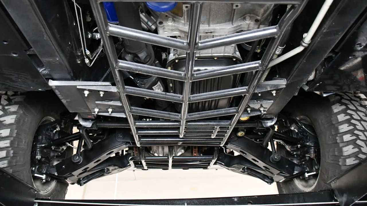 Aftermarket side steps assist entry into the cabin, which features black leather seating for four, heated front seats, power everything, cruise control, front and rear air conditioning, and switches for the Central Tire Inflation System. A Pioneer touchscreen infotainment system with aftermarket speakers and dual Alpine headrest screens also has been installed. Listening to the sounds of nature instead of the radio is as easy as removing the black soft top and stuffing it under the bed’s tonneau cover.