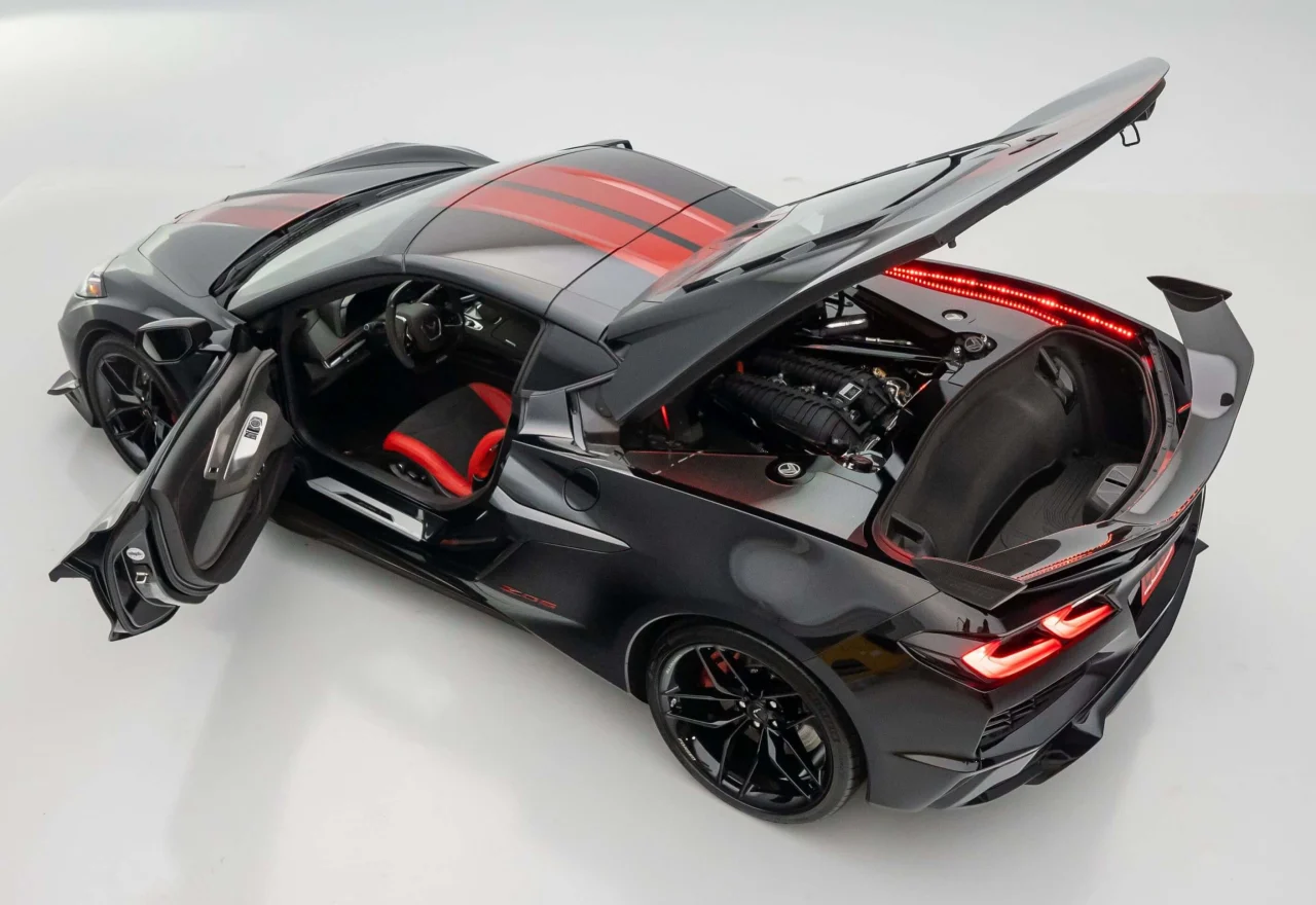 Parked beside it is the ferocious 2025 Corvette Z06, a modern American supercar powered by a 670-horsepower flat-plane-crank V8 that screams to an 8,600-rpm redline. Mid-engine balance, carbon-fiber performance upgrades, and aggressive blacked-out styling make this Z06 a statement piece wherever it goes. It’s refined, ruthless, and engineered to dominate roads and racetracks alike.